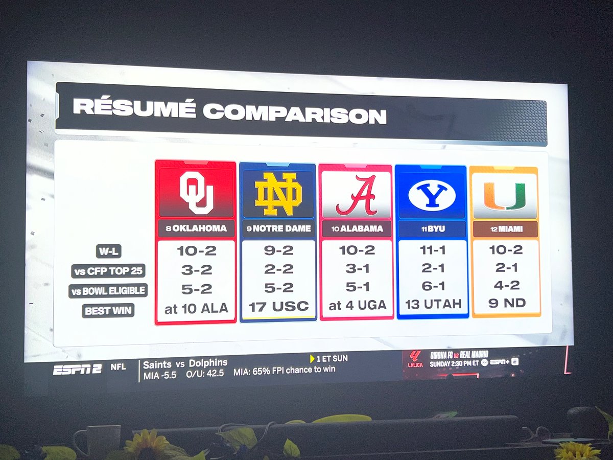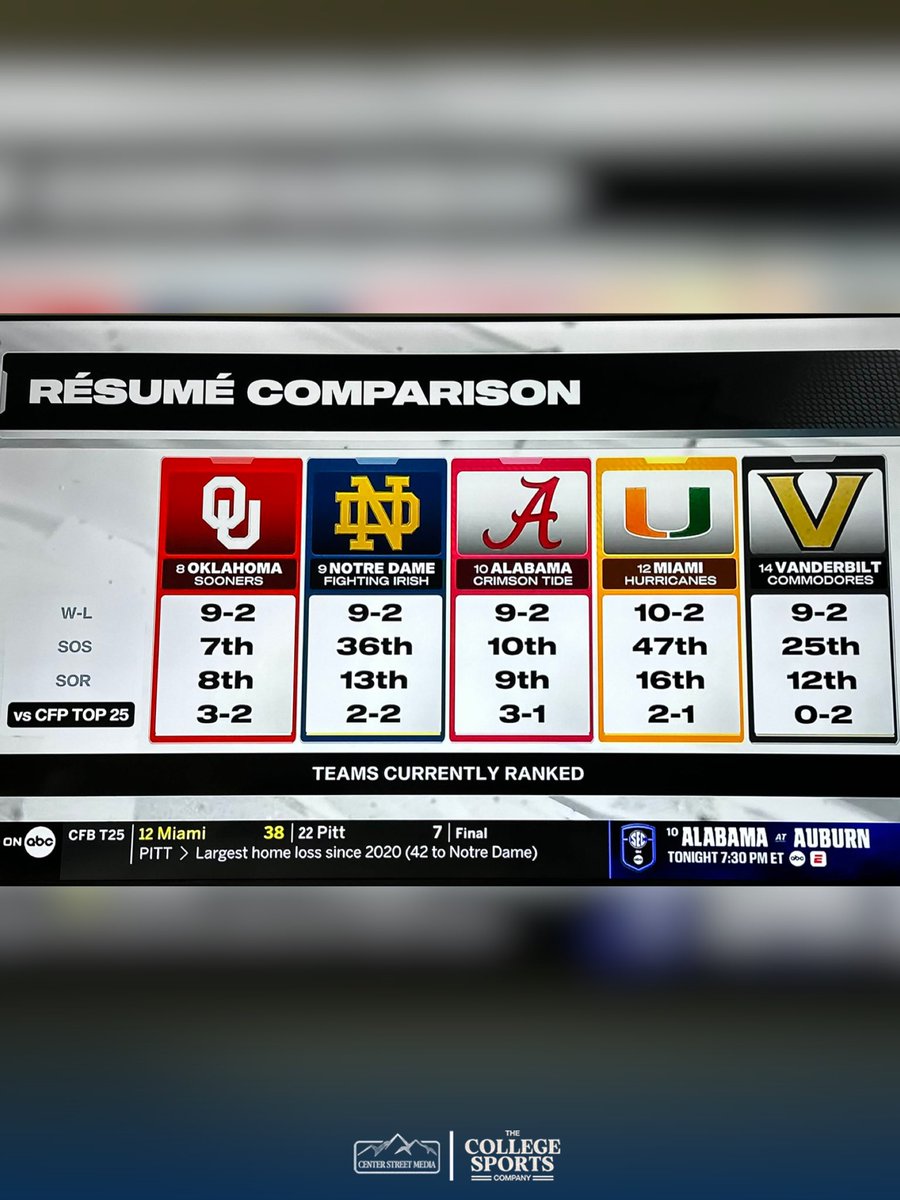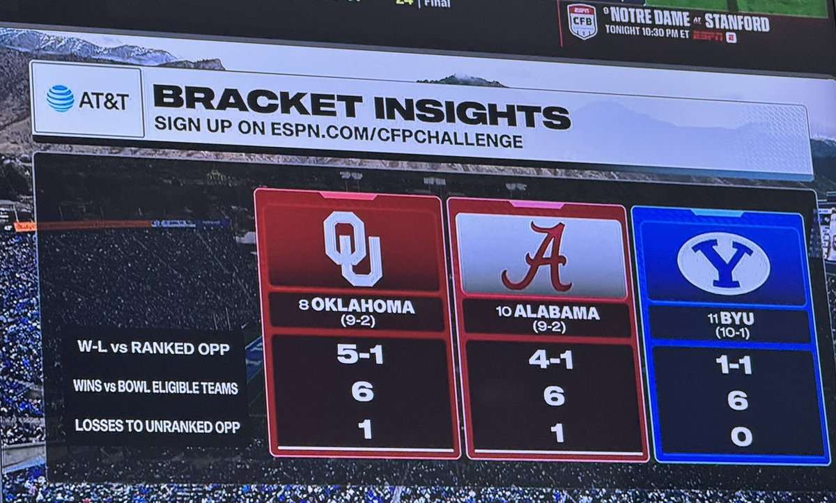 Now Pitt and Tennessee have both fallen out of the CFP rankings so Oklahoma, Alabama, Notre Dame and Miami all lost a ranked win compared to what was shown saturday evening. Maybe thats why they went back to excluding BYU from the discussion as now BYU has a better or equal(Alabama) record against ranked opponents compared to the other bubble teams.