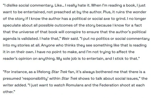 Fuck Project Hail Mary and Andy Weir, he’s an “anti-woke” piece of shit. I’ll never read or watch anything tied to his name.